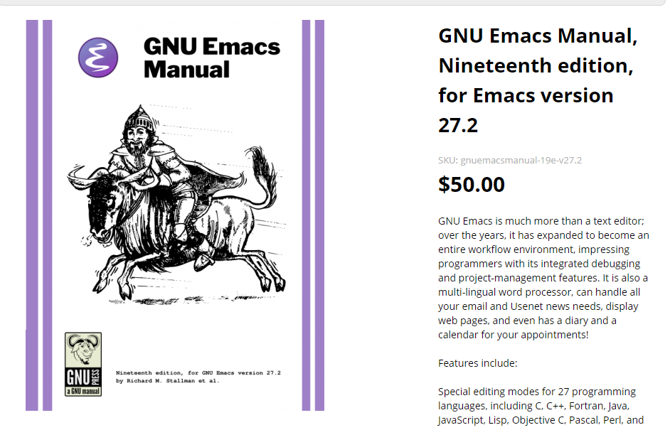 Либо же, можно воспользоваться интернетом и просмотреть документацию по https://www.gnu.org/software/emacs/manual/html_node/emacs/index.html или купить книжку за 50 $